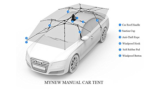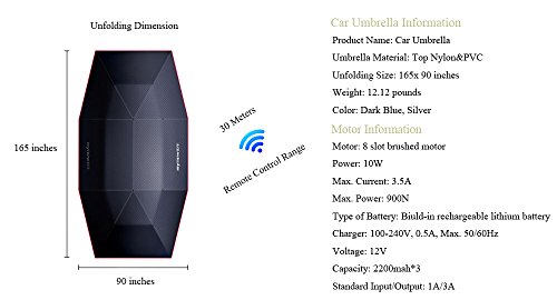 -. Feature : Folding and Portable: The car umbrella automatic folding structure is smart and stable which ensures every single action accurately and smoothly. 90cm in length after folded up in a storage bag and 5.5kg in weight, without any extra burden to your trunk / Easy to mount and fast to open: It takes 30 seconds to install and 8 seconds to open with a wireless remote control / Unfolding Size: 90x165 inches / 2300x4200mm, over 30 centigrade lower than cars exposed under the sun after the tent has been opened / Multifuction Car Protection: The big umbrella surface can protect cars from Dust, Acid Rain, Bird Dropping, Deciduous etc. / Windproof Design: The four windproof rope with hook in the four corners ensure the stability of the Car Umbrella
