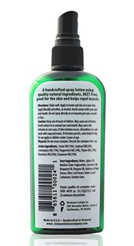 -. Brand : Vermont Lotion Company -. EAN : 0865611000241 -. Feature : DEET FREE INSECT REPELLENT Outdoor Defense does not contain DEET or other harmful chemicals / ORIGINAL FORMULATION with added benefit of LEMONGRASS and other Natural Essential Oils / HIGH QUALITY NATURAL INGREDIENTS AND ESSENTIAL OILS to ward off biting insects / NATURAL INSECT REPELLENT & MOISTURIZING LOTION 2 IN 1 repellent a natural insect repellent as well as a quality moisturizing lotion to help sooth and enrich your skin / REPELS BITING INSECTS such as Mosquito Ticks Black Flies Gnats and other biting insects naturally -. Label : Vermont Lotion Company -. Manufacturer : Vermont Lotion Company -. Model : 4 oz Outdoor Defense Citrus Spray -. MPN : 4 oz Outdoor Defense Citrus Spray -. PackageQuantity : 1 -. PartNumber : 4 oz Outdoor Defense Citrus Spray -. ProductGroup : Lawn & Patio -. ProductTypeName : OUTDOOR_LIVING -. Publisher : Vermont Lotion Company -. Size : 4 oz -. Studio : Vermont Lotion Company -. Title : All Natural Insect Repellent, DEET Free - Outdoor Defense Citrus Spray with Lemongrass Moisturizing Lotion 4 oz -. UPC : 865611000241