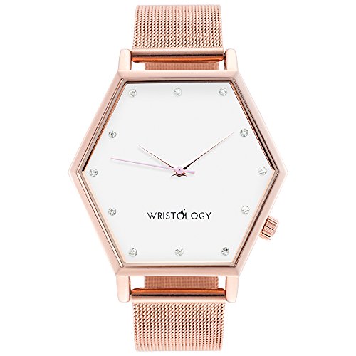 WRISTOLOGY Ellie Womens Hexagon Crystal Rose Gold Boyfriend Watch Metal Mesh Strap