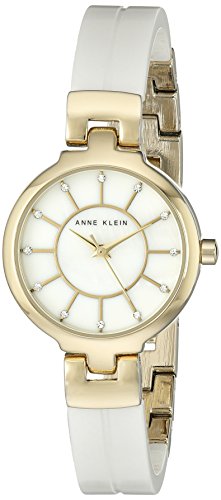 Watch set includes one case and three interchangeable bangle bracelets. Gold-tone mixed metal case. White ceramic, gold-tone, and slender gold-tone bangle bracelet with pavé crystals included. Three-hand analog display with quartz movement. White mother of pearl dial face features gold-tone stick indexes with crystal accents, and Anne Klein logo detail. Splash resistant. Imported.Feature