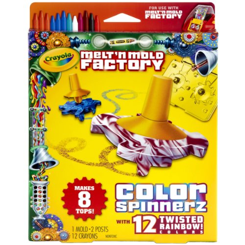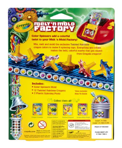 -. Binding : Toy -. Brand : Crayola -. EAN : 0799198895825 -. Feature : Mix, melt and mold the exclusive Twisted Rainbow Crayon Colors to make 8 spinning tops / Create customized multi color crayon / Everything you create makes the bold colorful marks that you would expect from Crayola Crayons / Melt and mold colorful wax to create your own creation / Refill packs extend creative play -. IsAdultProduct : 0 -. ItemPartNumber : 74-7-065 -. Label : Binney & Smith -. Manufacturer : Binney & Smith -. Model : 74-7065 -. MPN : 74-7-065 -. PackageQuantity : 1 -. PartNumber : 74-7-065 -. ProductGroup : Toy -. ProductTypeName : TOYS_AND_GAMES -. Publisher : Binney & Smith -. Studio : Binney & Smith -. Title : Crayola Melt 'N Mold Color Spinnerz Expansion Pack -. UPC : 885464734087 -. Warranty : No Warranty