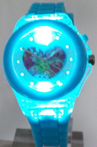 This watch is perfect for any child. It features a soft silicone band that will adjust to your child's wrist(6-8.5 inches) with 9 holes and a metal buckle clasp. The best feature of this watch is when you press the right corner button the entire face of the watch will start flashing colors for 15 seconds. You will be entertained to blue,red,yellow,green,whie,purple colors. Your child's friends will not be able to take their eyes off of this watch. The watch also comes in a shopkins gift box.Feature