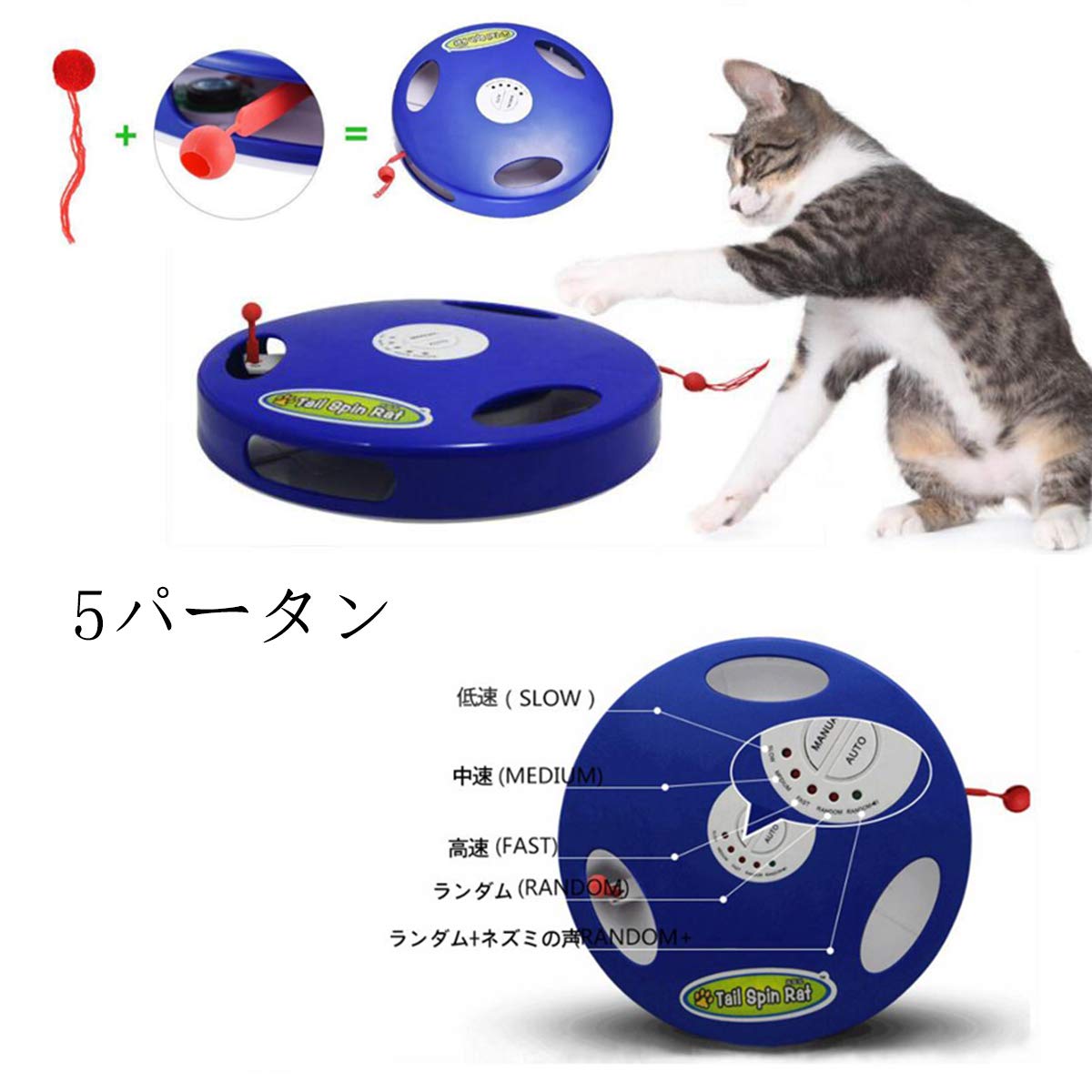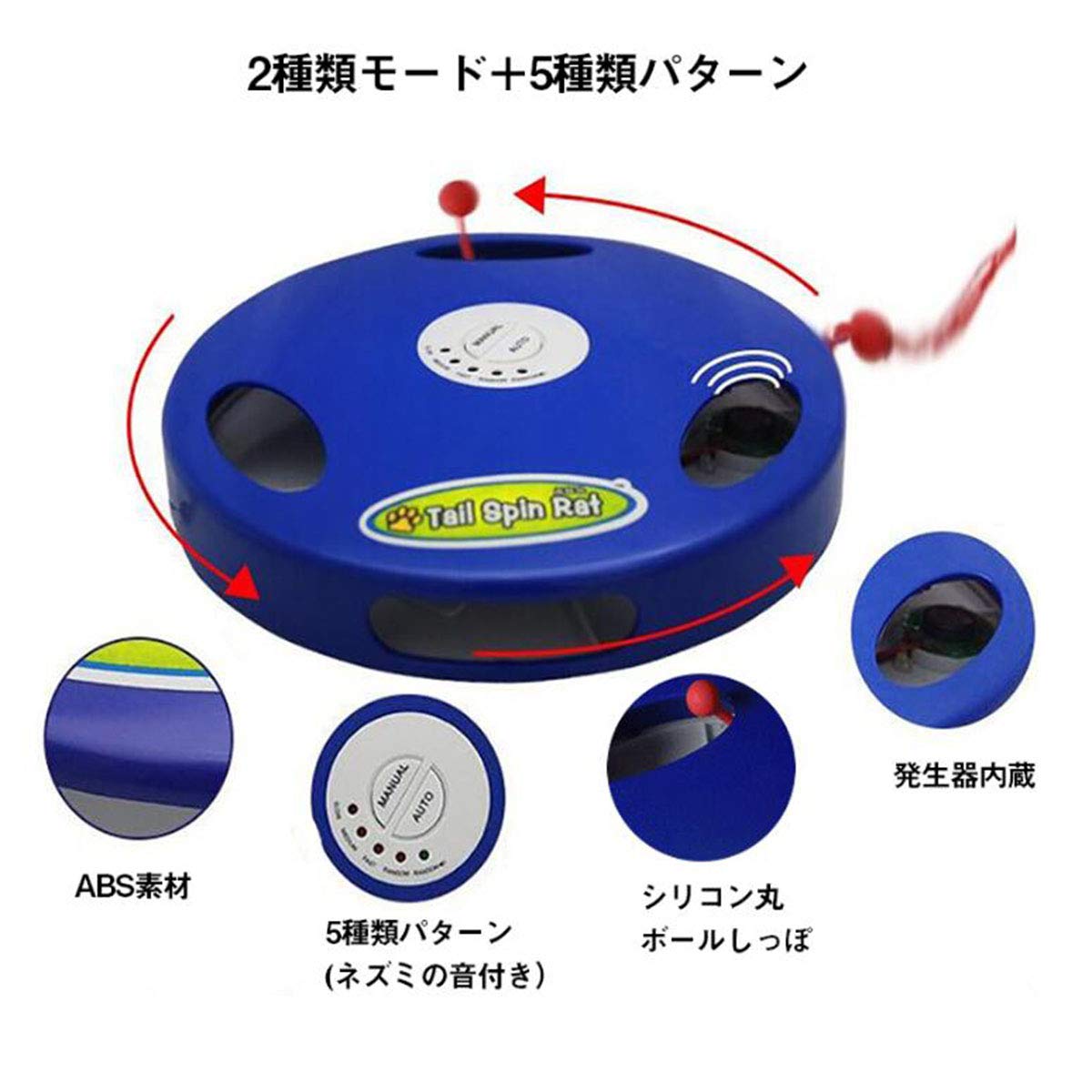【2モード+5パータン】電動おもちゃはマニュアルとオートモードの二種類有りまして猫が喜びそうなモードを手動で選択も出来ます。手動モード: SLOW(低速)/MIDDLE(中速)/FAST(高速)/RANDOM(ランダウ)/RANDOM(ランダム)+ネズミ声があり、各回約15分楽しめます。15分に作動すると、自動にオフします。オートモード:低/中/高/ランダム/ランダム+声があり、 1ずつ3分作動して、また自動に続きのモードを切り替えます。起動するときのパータンはSLOW(低速)です。いつも遊びたくない場合、自動スイッチ(AUTO)を押すとオフします。