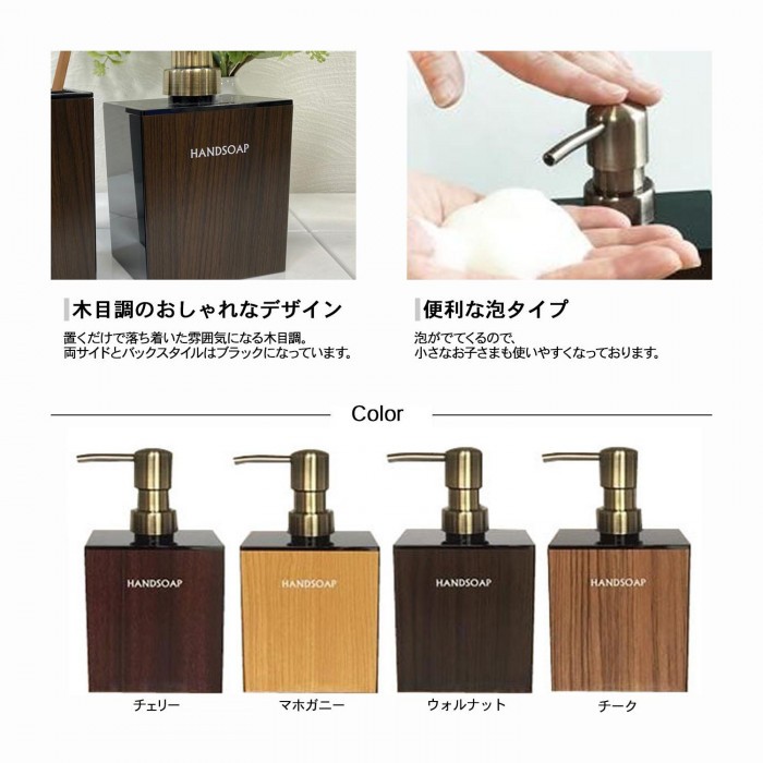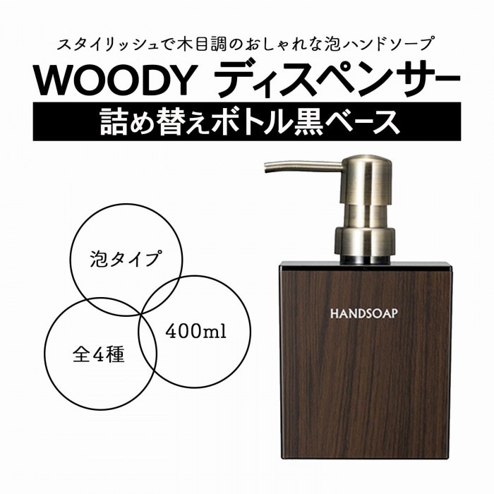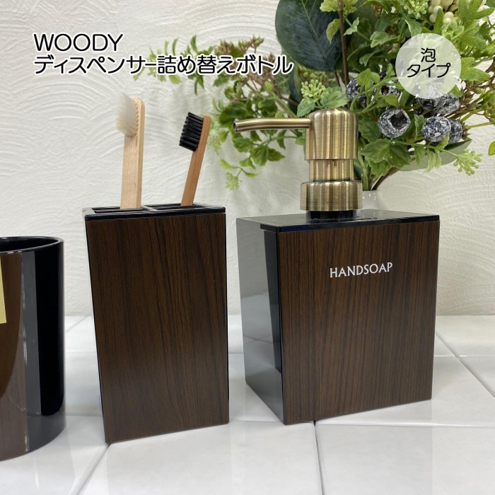 人気のWOODYシリーズから、便利な泡タイプが登場!置くだけで落ち着いた雰囲気になる木目調。両サイドとバックスタイルはブラックになっています。 |