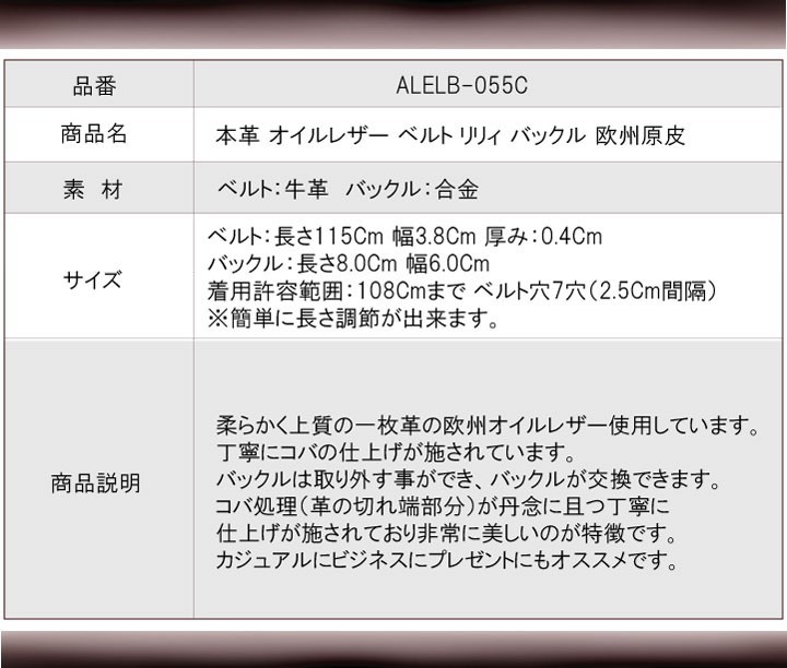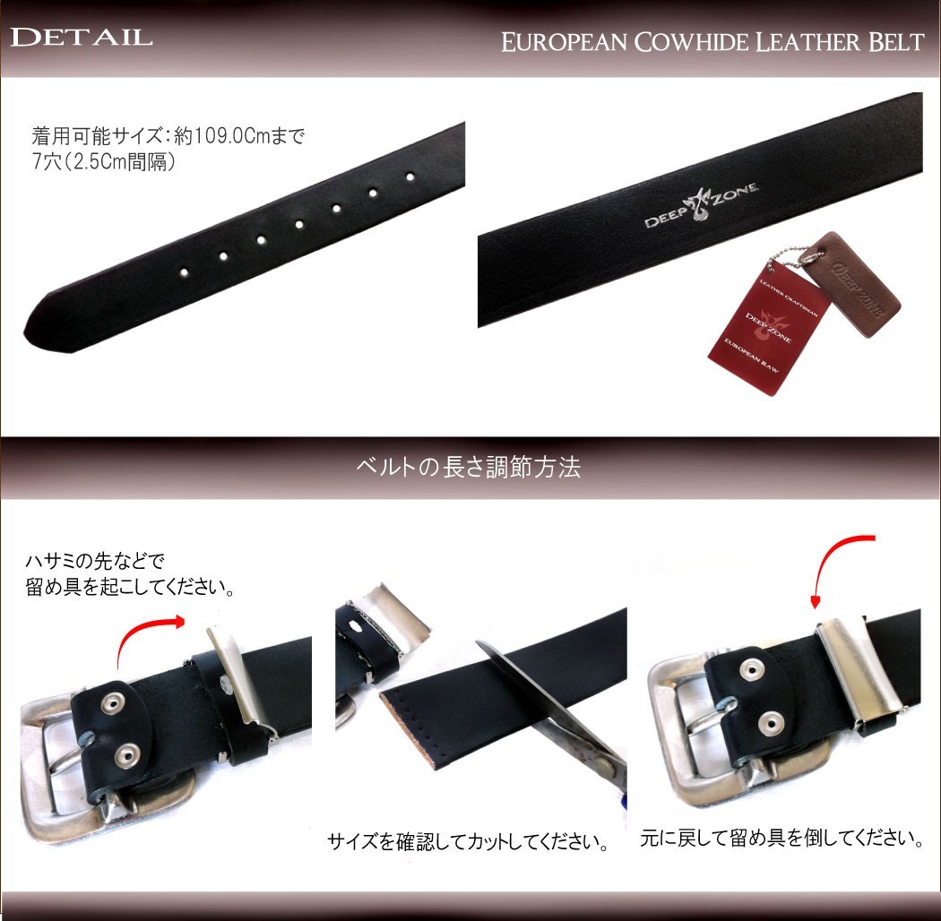 欧州産の原皮を使用しております。高いクオリティのタンニン鞣しが施されておりハリやコシもしっかりとある革になり使い込めば使い込むほどに美しい飴色に変化していく為、非常に人気な一枚革のオイルレザーベルトです。【素材】ベルト:牛革 バックッル:合金【サイズ】ベルト:長さ115cm 幅3.8cm 厚み:0.4cm 着用許容範囲:108cmまで ベルト穴7穴(2.5cm間隔) ※長さ調節できます。【カラー】ブラウン・ダークブラウン・ブラック【Deep Zone】ワイルドでセクシーを上品にまとめる男のレザーブランド。自分買いからプレゼントにも人気でオススメです。【素材】ベルト:牛革 バックッル:合金 着用許容範囲:108cmまで ベルト穴7穴(2.5cm間隔) ※長さ調節できます。【サイズ】ベルト:長さ115cm 幅3.8cm 厚み:0.4cm【カラー】ブラック【Deep Zone】ワイルドでセクシーを上品にまとめる男のレザーブランド。自分買いからプレゼントにも人気でオススメです。