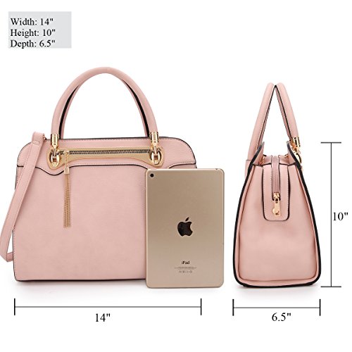 - ✈ FASHION DESIGN: Structured Soft PU leather construction with four metallic bottom studs(feet). Top zipper closure design keep your stuffs safe and secret. Soft round leather handles matched with removable and adjustable shoulder strap give you 3 ways to carrying-- tote, over the shoulder, crossbody. This designer handbag is accented with gold tone hardware and hinges. (No plastic feeling.) Also, the front decorative tassel fringed zipper (Unusable) make it more attractive and adorable.
