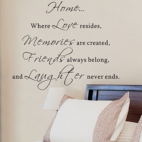 ReleaseDate : 2015-10-24 Studio : Pop Decors Publisher : Pop Decors Binding : Baby Product Product Description High quality wall art product by Pop Decors, creates hand painted look on your wall. Free squeegee. SIZE: 31"W Color: Black The text says: Home. Where Love resides, memories are created, Friends always belong, and Laughter never ends. Decals can be applied on smooth and clean surface (walls, glass, doors etc. . ). Not recommended for textured walls (orange, sandy and grainy), fresh paint (less than 14 days) or low VOC (Volatile organic compound) paint. Original designs by Pop decors. 2010 Copyrights Protected. . 0