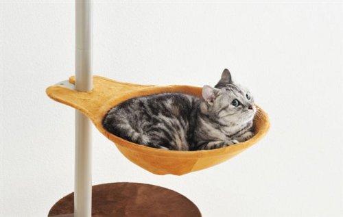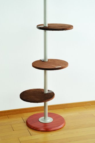 ホールタイプなので少ないスペースでも設置可能。天井への調整は伸縮パイプでらくらくフィット。場所を取らない省スペース&モダンデザイン。ジョイントしてネジ止めだけで、組み立て簡単。棚板やハンモックは各段45度刻みで回転させて、お好きな位置で固定できます。棚板5枚とハンモックが1台ついています。
