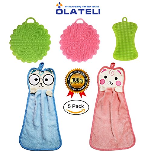 Silicone Dish Scrubber Sponge Kitchen Brush Practical Washing Tools Soft and Flexible and Cartoon Towel Kitchen Bathroom Hanging Towel, Easy to Reach Corners of Glasses and Cups - Buy 1 get 5 Items