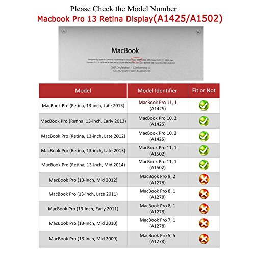 -. Feature : Material: Polycarbonate. 2-piece light weight hard Shell covers,Protect your MacBook from scrapes and scratches.Fully vented for safe heat disbursement. / Compatible with Model:A1502 Release 2015 / 2014 / 2013 - MF839LL/A, MF840LL/A, MF841LL/A, MGX72LL/A, MGX82LL/A, MGX92LL/A, ME864LL/A, ME865LL/A, ME866LL/A and Model: A1425 - MD212LL/A, MD213LL/A, ME662LL/A, ME664LL/A / Anti-skidding and frosted finish humanized design will make you feel to be more comfortable,Silky-Smooth Soft-Touch Hard Protection.Easily slips in and out your bag while retaining a grippy edge for your peace of mind.
