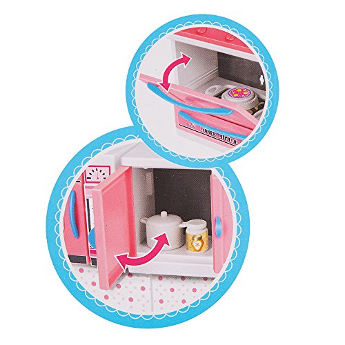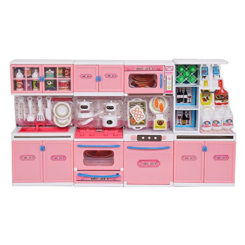 -. Feature : Includes tons of accessories such as mini cups, plates, utensils, pots, pans, food, as the photo showed. / Function: Light and Sound,use 2*AAA battery(not included) / All doors and cabinets open:Explore this detailed kitchen and let your child organize and play anyway they want! / *Come with a display box for gift.