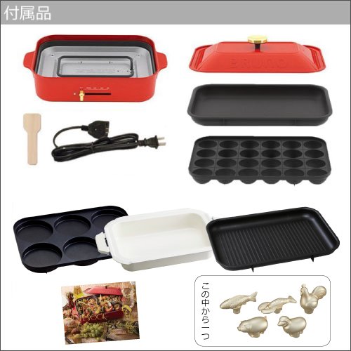 【부속품】뚜껑×1,평평함등 플레이트×1,타코야끼 플레이트×1, 멀티 플레이트×1,그릴 플레이트×1, 세라믹 코트과,레시피(요리처리법) 북,데코레이션 노브,목제 스파《추라》×1