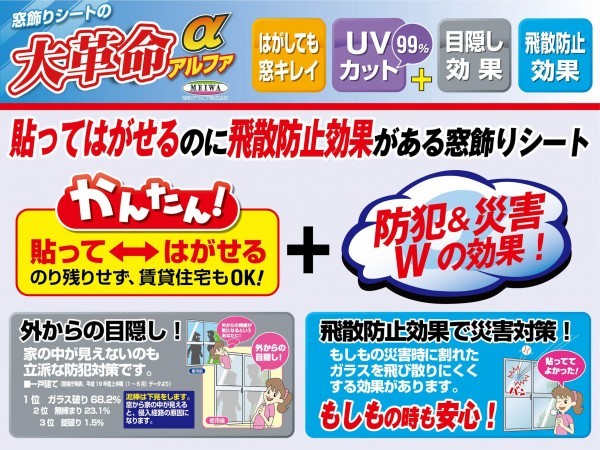 | 貼ってはがせる飛散防止効果のある窓飾りシート! |