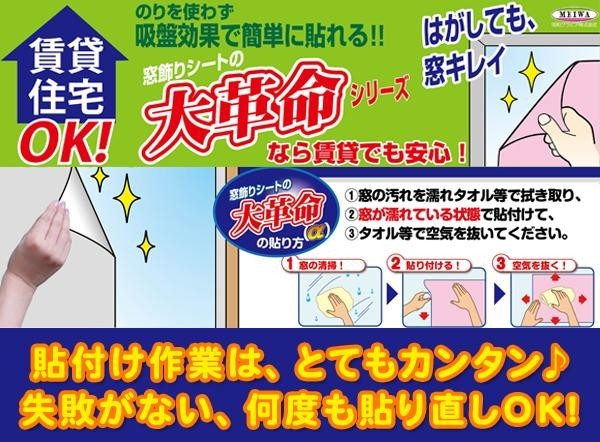 窓を濡らした状態にして貼りつけるだけ!!簡単で、剥がした時に糊が残ることがないので、賃貸住宅でもご利用いただけます♪ |