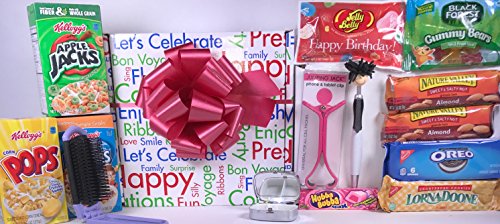 - Also includes: Handy Folding Mirror/Hairbrush (Assorted Colors), Jumping Jack Phone & Tablet Clip Holds Your Phone Upright (Assorted Colors), 1.5 oz Black Forest Gummy Bears (Made with Real Fruit Juice and Colors from Natural Sources), Jelly Belly "Happy Birthday!" 1 oz. Gourmet Jelly Beans, 2 Nature Valley Sweet & Salty Almond Granola Bars, and Hubba Bubba Gum