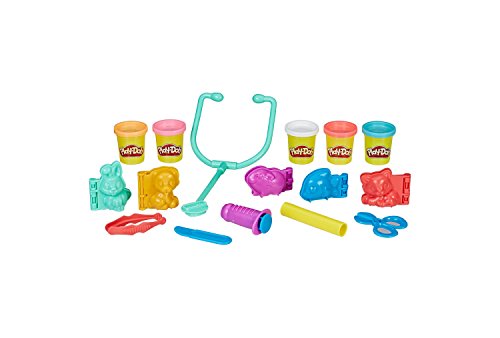Play Doh Exclusive Set lets play begin by First, shape adorable animals like puppies, bunnies, and kitties with the molds and 5 Play-Doh colors. Then it's time to give them a check-up and fix their boo-boos! Stamp or squeeze bandages with the stethoscope or syringe and pick them up with the tongs. The pets will feel better in no time!