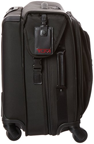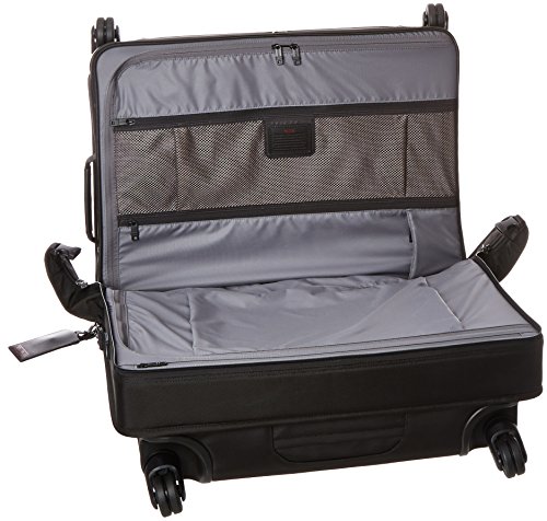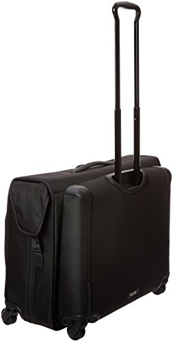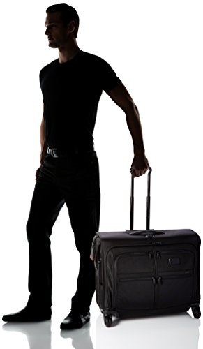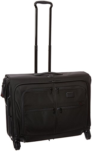 Studio : Tumi Publisher : Tumi Binding : Apparel Product Description Updated with a new four-wheel design for effortless maneuverability, this full-feature garment bag makes traveling with suits or dresses a breeze. Pack up to two suits plus folded clothes and accessories and wheel it effortlessly to wherever you are going. There is a large exterior compartment for additional clothing, two front U-zip pockets for last-minute items, shoes or a travel kit. Separate shoe pocket holds up to two pairs of shoes. Features a top carry handle and telescoping handle. Crafted from TUMI's ultra-durable FXT ballistic nylon. 0