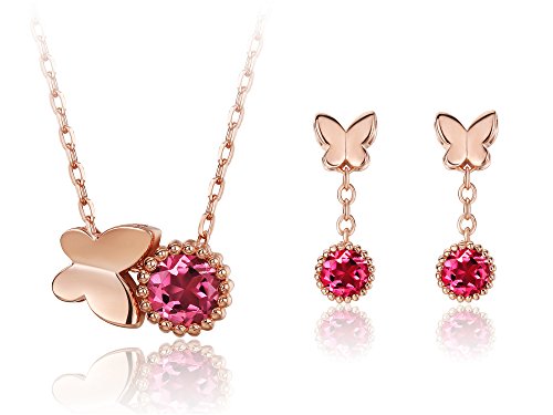 -. Title : EverFlawless バタフライ モチーフ レディース ネックレス ピアス セット ルビー 誕生石 パワーストーン K18メッキ 925純銀 アズキ 紅玉
