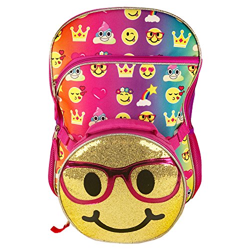 Emoji 16" Inch Backpack & Lunch Bag Set - Emojicon Style With Gold Sequin Removable Lunchbag