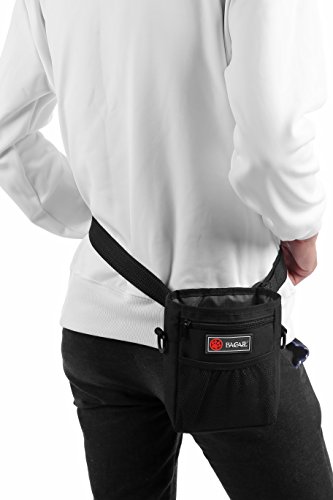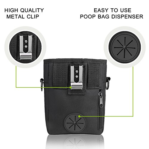 -. Feature : Easily Carries Pet toys,Kibble &Treats: The pouch is large enough to hold in amount of dog training treats, accessories, dog toys.And you'll also love the built-in poop bag dispenser that gives you a clean dog waste bag right when you need it most. / Multiple Pockets for Convenience: Enjoy the 2 zippered pouches and front mesh netting for safely storing your smartphone, money, keys, dog whistle or dog clicker while taking that relaxing evening stroll with your pup. Carry everything you need to make dog walking fun and safe. / 3 Easy Ways to Wear: The package comes with an adjustable long strap and belt, plus a sturdy belt clip. You have 3 ways to wear to meet your comfort requirements, simply choose to wear using the removable 42" adjustable waistband, removable shoulder strap, or strong metal belt clip. / Convenient Pet Bowl: The bowl is made from Food-Grade silicone that can holds up to 12 fluid ounces of water or 1.5 cups of dog food, so you can feed the pet whenever and wherever you like. / Package Includes: 1 x Dog Treat Training Pouch, 1 x Waist Strap, 1x Shoulder Strap ,1 x Collapsible Dog Bowl.100% Satisfaction Guaranteed Warranty.90 Days for a No-Question-Asked Refund,12-Month Manufacturer's Warranty.