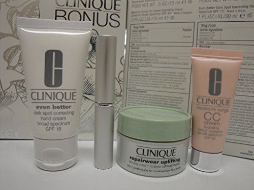 - Title : Clinique 4 PC Travel Set - Moisture Surge CC Cream SPF 30, Even Better Dark Spot Correcting Hand Cream SPF 15, Repairwear Uplifting Firming Cream Broad Spectrum SPF 15 and Almost Lipstick in Black Honey