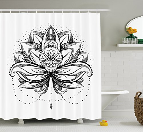 Lotus Shower Curtain by Ambesonne, Tribal Tattoo Style Lotus Petal with Dots Shadow Ornamental Tribal Ethnic Icon, Fabric Bathroom Decor Set with Hooks, 70 Inches, Seal Brown White
