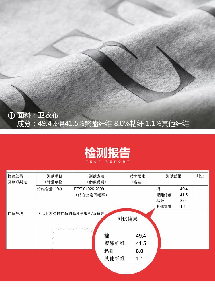 | 面 料:49.4%棉41.5%聚酯纤维 8.0%粘纤 1.1%其他纤维 罗纹:97.9%棉 2.1%氨纶颜 色:灰色 |