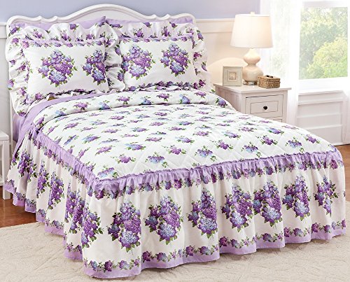 Description Quilt-top bedspread features a beautiful lilac pattern with delicate details atop a white background. The full, ruffled skirt with large lilac bouquets provides the finishing touch. Shams sold separately. Machine wash. Polyester and cotton; imported. Available in Full (108" x 96"), Queen (112" x 102") or King (118" x 112").