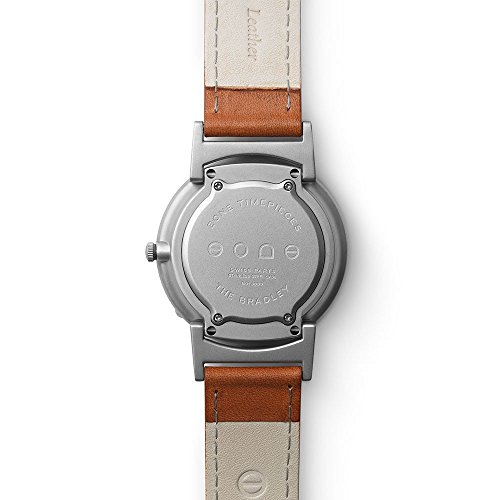 -. Feature : DIMENSIONS 40 mm (diameter) / 11.5 mm (thickness) CASE MATERIAL Stainless Steel / Aluminum / FITTING Wrist size 6¼ - 8½ in / 20 mm width (end connecting to lug) to 18 mm (end connecting to buckle) / 168 - 215 mm (10 holes each 5.5 mm apart) / WRISTBAND MATERIAL Italian leather with detailed stitching BATTERY Renata 371 button cell watch battery / WATER/SHOCK RESISTANCE Bradley will easily withstand splashes or brief immersion in water, like getting caught in the rain or washing hands. However, it is not sufficiently resistant for water sports, swimming or bathing. Bradley is NOT intended to be worn during high level activity sports. The stainless steel casing is not scratch resistant.