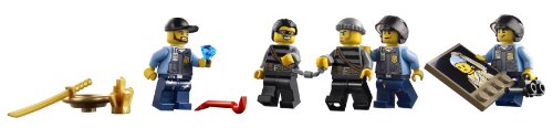-. Feature : Includes 6 minifigures: 2 burglars, Elite Police pilot, driver and 2 Elite Police officers, all with assorted accessories / Features opening rooftop window / Arrest the burglars / Accessories include painting, blue diamond, sword, plate and a gold net element / Vehicles include Elite Police van; Elite Police helicopter and a burglar get away van