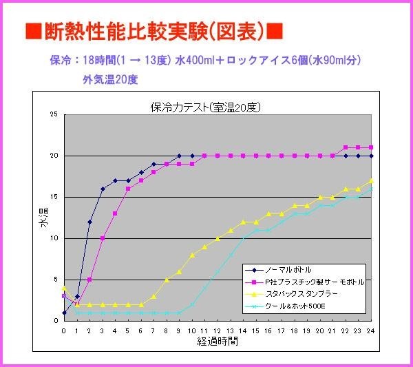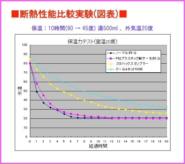 | ステンレス『真空断熱』構造で、冷たい飲料で約18時間、温かい飲料で約10時間、効果を発揮します(外気温20度の場合)。 |