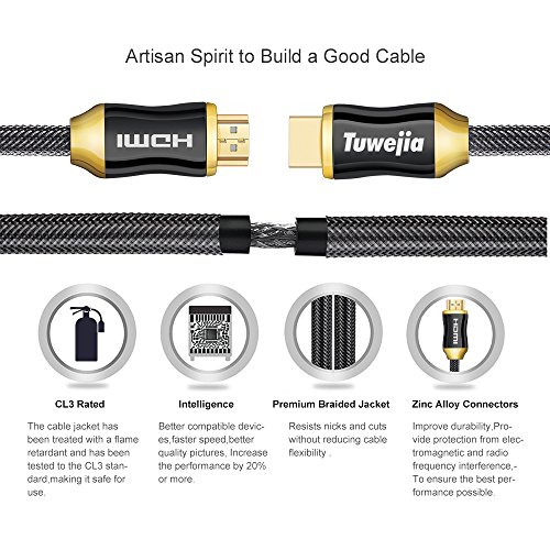 HDMI Cable Tuwejia CL3-Ultra High Speed HDMI 2.0(4K)Ready-18Gbps-28AWG nylon Braided Gold Plated Connectors-Ethernet,Audio Return-Video 2160pHD1080p3D-Xbox PlayStation PS3PS4 PC Apple TV etc (10Feet)