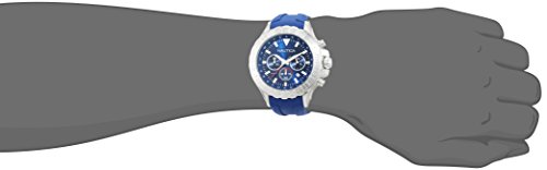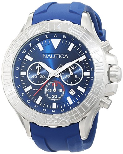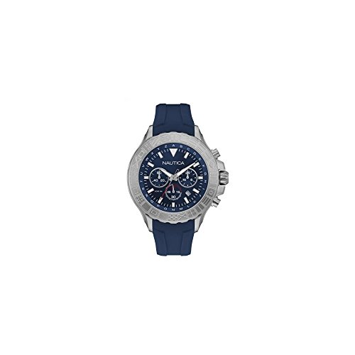 Silver-tone stainless steel case with a blue silicone strap. Stainless steel bezel. Navy dial with silver-tone hands and index hour markers. Dial Type: Analog. Luminescent hands. Date display between 4 and 5 o'clock position. Chronograph - sub-dials displaying: three - 60 second, 60 minute and 24 hours. Quartz movement. Scratch resistant mineral crystal. Solid case back. Round case shape. Case size: 47 mm. Buckle clasp. Water resistant at 100 meters / 330 feet. Functions: chronograph, date, hour, minute, second. Sport watch style. Nautica NST 1000 Blue Dial Chronograph Mens Watch NAD18534G.Feature