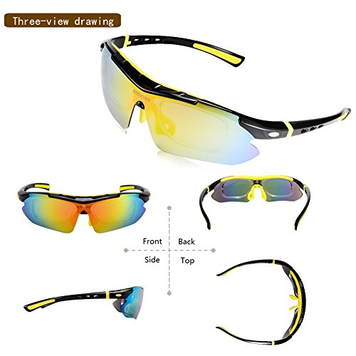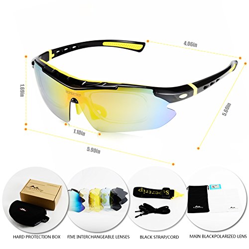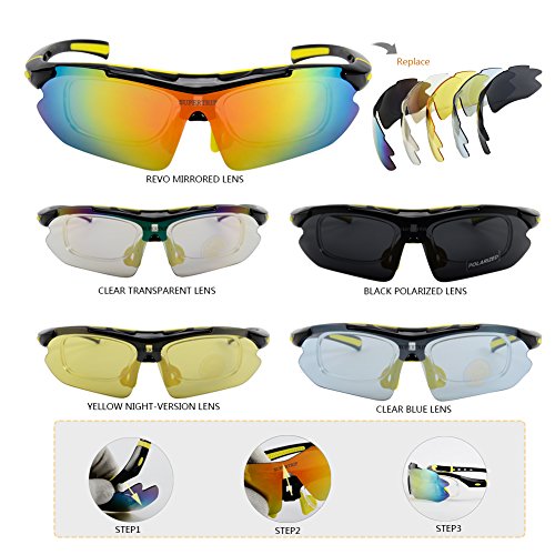 Five pairs of lenses:1)Yellow lens:Called night vision lens, more bright and clear.Suitable for twilight morning and in dim lighting conditions.2)Blue Lens:Filtering dazzling light on the sea,suitable for playing on the seashore.3)Clear lense:Absorbing infra-red radiation,suitable for overcast and rainy day.4)Revo lens:Protect eyes from the damage of ultraviolet.Suitable for those people who work in the condition of strong and bright light.5)Polarized lens:anti-glare,UV400 protection,Suitable for driving,fishing,climbing,cycling and others outdoor sport.