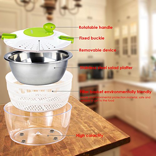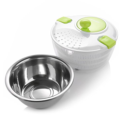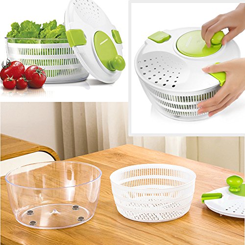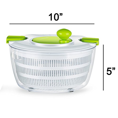 Product Description The salad spinner washes and dries lettuce and other leafy greens quickly and easily with just a few spins. Also great for washing fruits and vegetables. A handy spout located on the lid allows water to pour out the top and keeps the salad locked into place. 0
