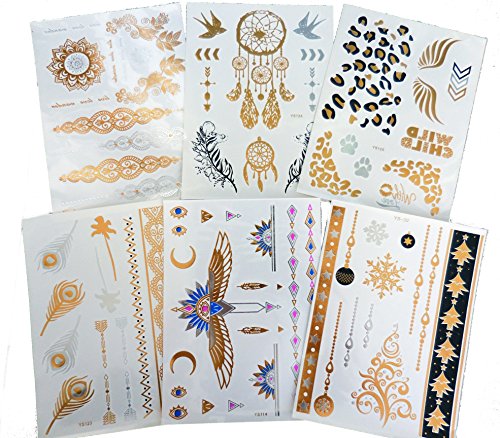 -. Title : 6 Premium Sheets Stunning Metallic Flash Temporary Tattoos - 150+ Shimmer Designs in Gold, Silver, Black - Temporary Fake Jewelry Tattoos - Bracelets, Feathers, Wrist & Arm Bands