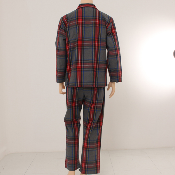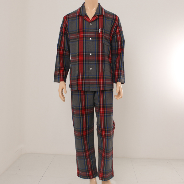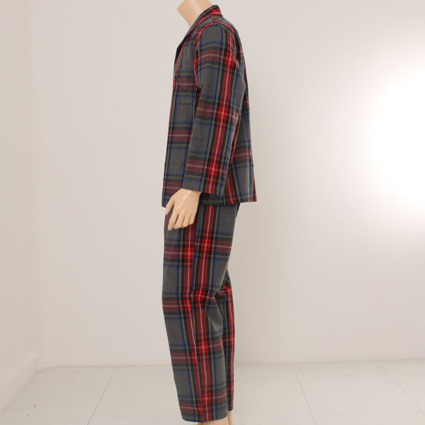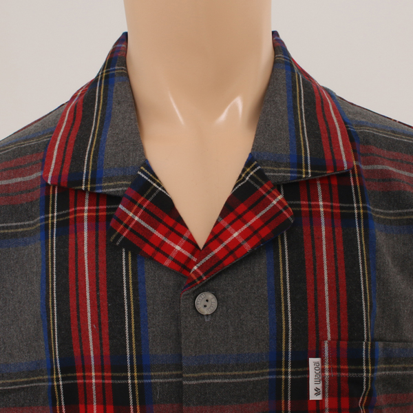 회색 멜란지 원단에 레드 포인트로 클래식한 와코루만의 체크 컬라감의 패턴으로 고급스러우면서 세련된 파자마
