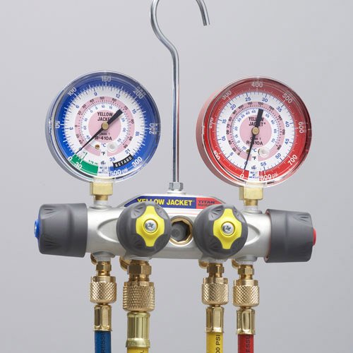 Yellow Jacket 49977 Titan 4-Valve Test and Charging Manifold degrees F, psi Scale, R-22/410A Refrigerant, Liquid Gauges