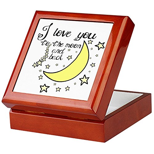 -. Binding : Kitchen -. Brand : CafePress -. Feature : Made of solid lacquered Alderwood / Measures 5 1/4" sq. x 2 1/8" with a 4 1/4" tile and hinged lid -. Label : CafePress -. Manufacturer : CafePress -. MPN : 642909754 -. PartNumber : 642909754 -. ProductGroup : Home -. ProductTypeName : HOME -. Publisher : CafePress -. Studio : CafePress -. Title : CafePress - I Love You To The Moon And Back - Keepsake Box