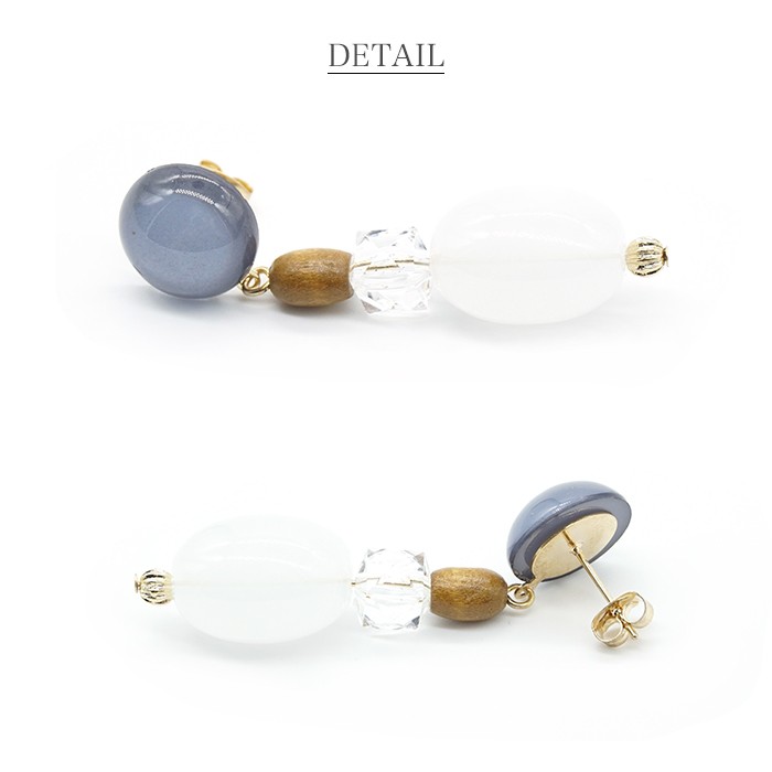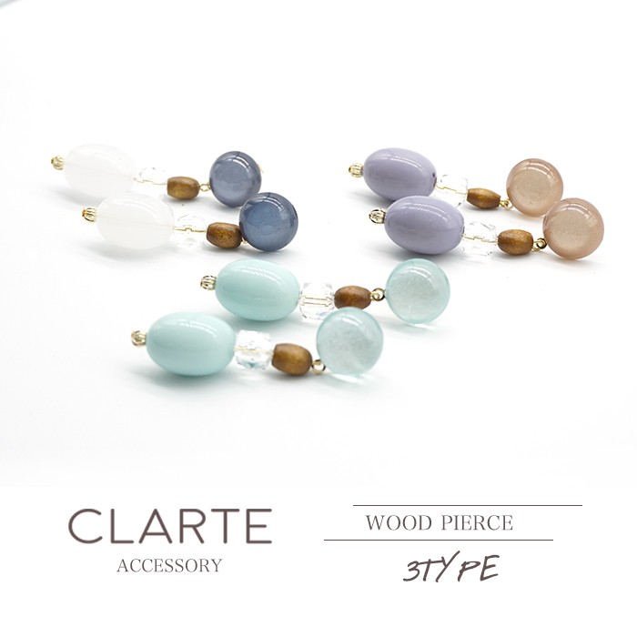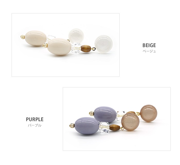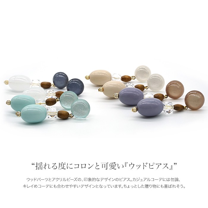 ウッドパーツとアクリルビーズの、印象的なデザインのピアス。カジュアルコーデには勿論、キレイめコーデにも合わせやすいデザインとなっています。ちょっとした贈り物にも喜ばれそう。