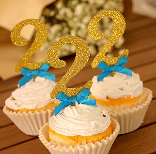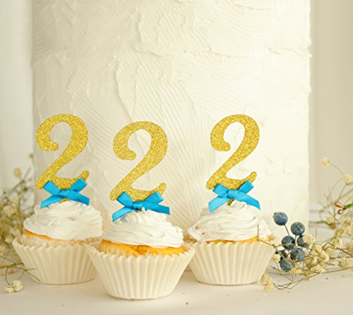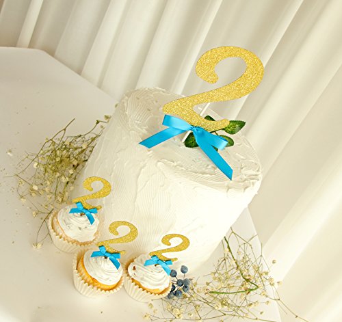Includes: 1 pcs big gold glitter "2" cake topper with royal blue bow, 12 pcs gold glitter "2" cupcake toppers with royal blue bows.