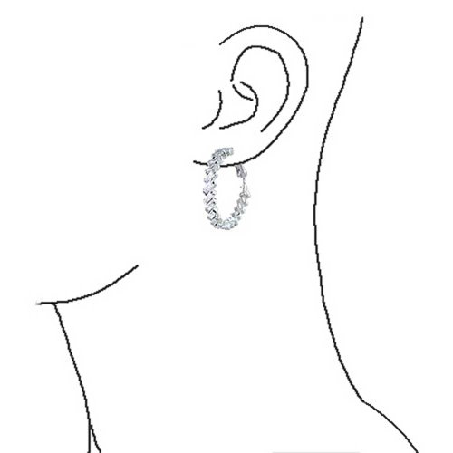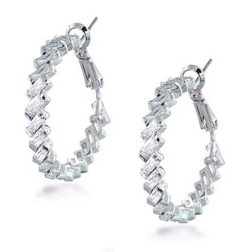Make a chic statement with our CZ Baguette Silver Tone Hoop Earrings. These sparkling CZ hoops look sensational with cool khakis, beiges, and whites during the warm weather months. Cubic zirconia hoop earrings are easy to wear with their omega backs and easy on the budget. An affordable earring with flash and dash. Plunge into the summer with these dazzling and light catching CZ hoop earrings.Feature