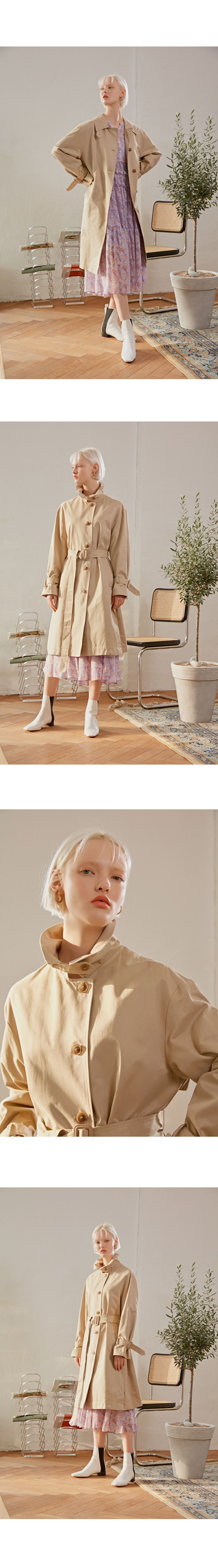 빅한 카라가 포인트인 트렌치 코트입니다.