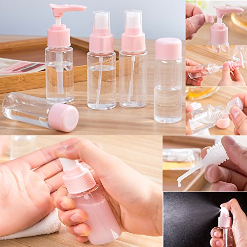 - 7 PACK TRAVEL BOTTLES AS GIFT: 1x30ml pump bottle, 1 x 30ml spray bottle, 1 x 40ml spray bottle, 2 x 10ml cream jars, 1 x pipette. Made of safe PET material, Top quality, Non-toxic, Washable and reusable, suitable for travel. Clean, durable, and resilient to contamination and leakage.