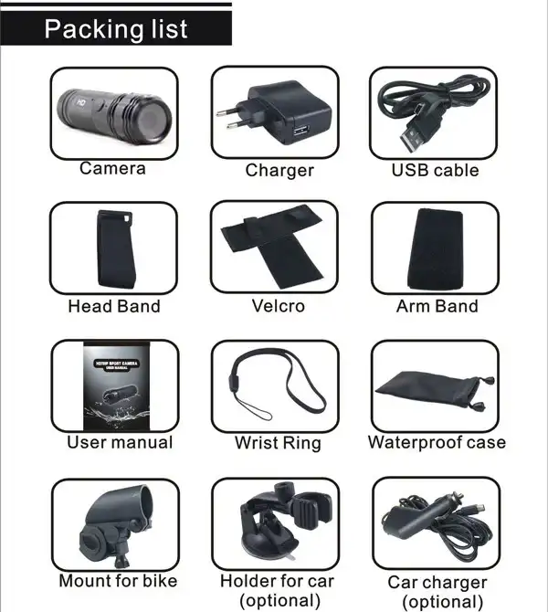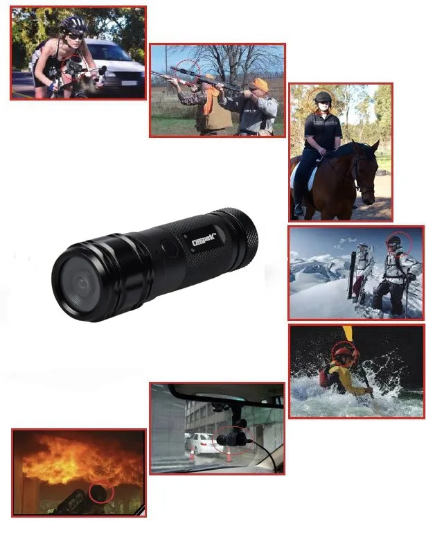 2) Water resistant: that means weather proof. For outdoor sports use, such as biking, horsing and hunting, it is very important! It can be used even in rain or snow.   3) Duralumin shell with Acrylic lens: can work in high temperature, and safe for men. Even fall down, no hurt, as Acrylic has not sharp debris when broken.   4) Clear sound record even in weatherproof condition.   5) Long working time: can work at least 2.8 hours, it is also important for fun. 6)Extendable up to 32G Micro SD card (not  included) 7) Hand-free, suitable for use in sports  like cycling, riding, hunting, surfing, boating ,Can easily be mounted on helmet, bike, boat, gun, car black box, or anywhere else.
