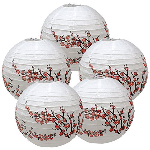 Just Artifacts (Set of 5) 16" Red Peach Blossom Flowers White Color Chinese/Japanese Paper Lantern/Lamp - Just Artifacts Brand
