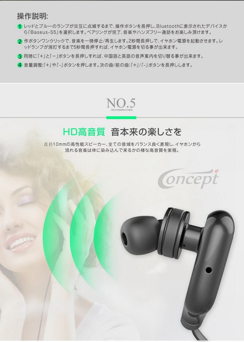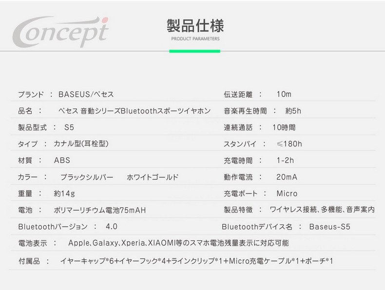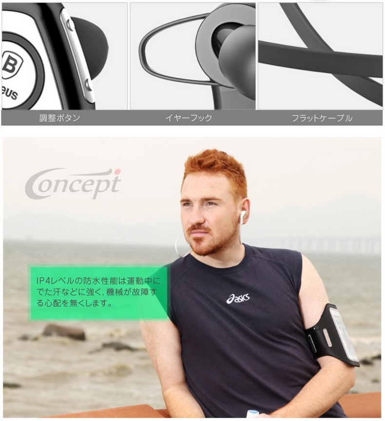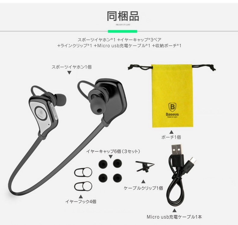 ブランド名 :BASEUS/べセスBluetooth仕様:Bluetooth4.0通信可能距離 :約10m(障害物がない場所)充電時間:約1-2時間重量 :約14g材質 :高品質ABS対応機種:iPhone、Xperia、Galaxy、AQUOS Phone、その他、パソコンなどのブルートゥース対応機種。スポーツに最適なべセスブランドのカナル型Bluetoothイヤホン。高品質高性能さらに長時間使用しても疲れを感じにくい抜群のフィット感。人工知能音声認識機能搭載。電話着信時、「イエス」「ノー」を回答すれば、ハンズフリーで着信の応答/拒否の操作が可能。CVC6.0ノイズキャンセリング技術で周囲の雑音を抑制し、必要な音だけをご提供。長時間長持ちバッテリーで、連続5時間の音楽再生が可能。更にIP4レベルの防水機能付きなので、運動で出た汗や急な雨にも機械が故障する心配がありません。※ こちらの商品はクロネコヤマトDM便サイズオーバーの為、日本郵便定形外での発送となります。追跡サービスがご利用できませんので予めご了承の上ご購入下さい。