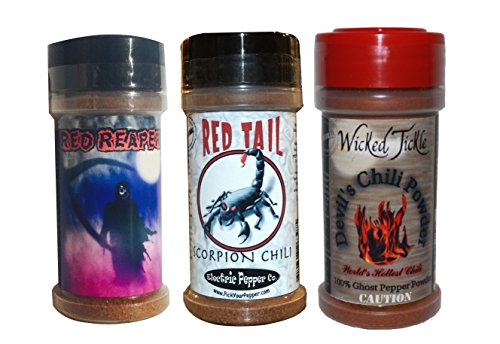 -. Binding : Misc. -. Brand : Wicked Reaper -. Color : red -. EAN : 0796762848348 -. Feature : Spice Gift Set / Ghost Pepper Chili Pepper Powder / Carolina Reaper Chili Pepper Powder / Scorpion Chili Pepper Powder -. IsAdultProduct : 0 -. Label : Electric Pepper Company -. LegalDisclaimer : Do not use if you have a respiratory or heart condition. -. Manufacturer : Electric Pepper Company -. NumberOfItems : 1 -. PackageQuantity : 1 -. ProductGroup : Grocery -. ProductTypeName : GROCERY -. Publisher : Electric Pepper Company -. Size : 1.5 oz x3 -. Studio : Electric Pepper Company -. Title : Spice Gift Set Chili Pepper Powder Ghost Trinidad Moruga Scorpion Powder Carolina Reaper Chili Spice 3 Pack -. UPC : 796762848348