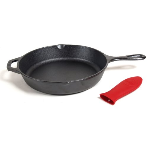 -. Feature : Cast Iron with red silicone handle cover / Pre-seasoned / 2 convenient pour spouts / Handle cover is heat resistant up to 450 degrees F / Made in the USA