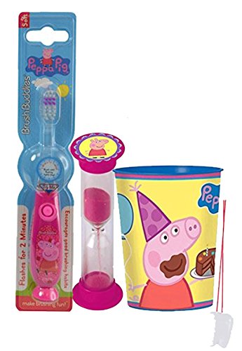 -. Feature : Turn something your kids have to do into something they want to do with the help Peppa Pig....Because when brushing is fun, it gets done! / (1)Peppa Pig Flash Light Up Toothbrush (Assorted Colors) / (1) Peppa Pig 16oz Plastic Mouthwash Rinse Cup, Doubles As Toothbrush Holder! / (1) Dentist Recommended 2 Minute Peppa Pig Themed Brushing Timer (Assorted Styles) / Plus Bonus "Remember to Brush" Visual Aid Tooth Saver Necklace. Hang it in their bathroom or by their bed so they remember to keep their chompers sparkly fresh. You could also use these tooth charms to save one of your child's baby teeth.